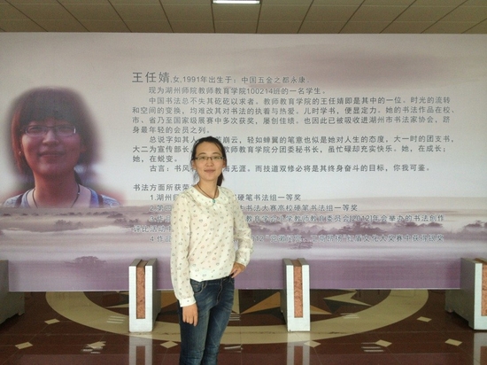 王任婧自八歲開始學習書法,目前已經堅持了15年?,F在練字已經成了王任婧生活的一部分,一有時間就會進行書法的臨摹。字如其人,重若崩云、輕如蟬翼的筆意,似乎是她對人生的態度,她說從寫字中能夠學會怎樣做人,學會心平氣和地對待事物,“坐著不停地寫一天的字,也不會覺得累。寫字鍛煉了我,讓我做什么事情都能很有耐心?!蓖跞捂赫f。經過多年的努力,王任婧在書法上取得了不菲的成就,作品《非常》在全國教師教育學會小學教師教育委員會2012年會舉辦的書法創作評比活動中榮獲一等獎,在第四屆浙江省大中小學生書法大賽中獲高校硬筆書法組一等獎,作品《書譜序》在永康市“黨徽閃亮 工商昂揚”紅盾文化大獎賽中榮獲銀獎等,目前已躋身湖州市書法協會會員,成為最年輕的會員之一。