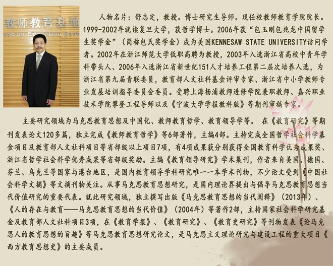 舒志定:我的主要研究領域是教育哲學。近年來主要聚焦馬克思教育思想及其當代價值、教師教育學、教育領導學等領域的教學、研究和人才培養工作。其中,馬克思主義教育思想及當代價值研究,我是從2002年開始就一直堅持研究到現在,主持完成馬克思教育思想研究的國家社科基金項目和教育部人文社科項目,去年又主持《馬克思人學教育思想當代價值研究》等教育部人文社科項目,研究論文在《教育研究》、《教育學報》等期刊發表,出版《馬克思教育思想的當代闡釋》《人的存在與教育—馬克思教育思想當代價值》等著作。教師教育哲學研究也是我的研究興趣。我是從東西方教育哲學思想匯通中闡述教師教育哲學的理論框架,從解釋學教育學、現象學教育學等教育思潮中尋求中國教師教育哲學理論構建的思想資源。與教師教育研究相關的,是教育領導學的研究。這也是我新拓展的研究領域。教育領導學是教育管理理論發展的新成果。管理是如何把事情做正確,而領導則是做正確的事情。這三個研究領域,我是用馬克思提出的“現實中個人”作為研究教育的邏輯起點,以“人是對象性存在”作為研究教育的思想方式,使三個研究領域的研究假設與研究旨趣相互關聯、一以貫之。