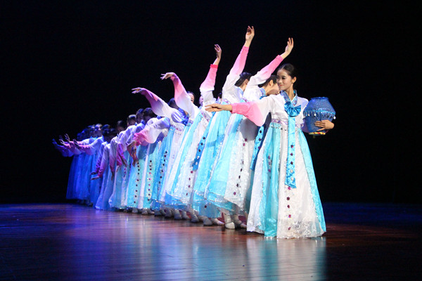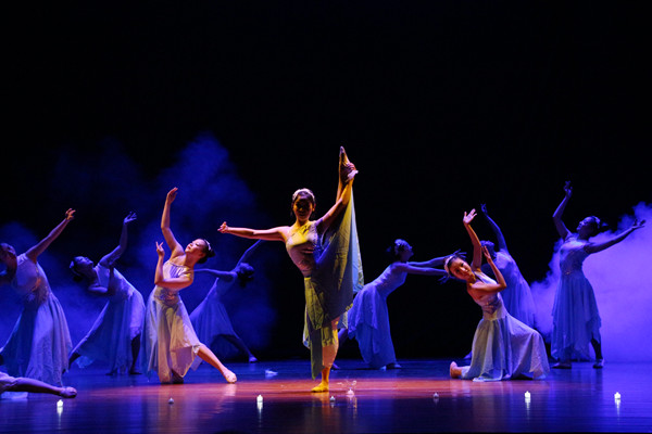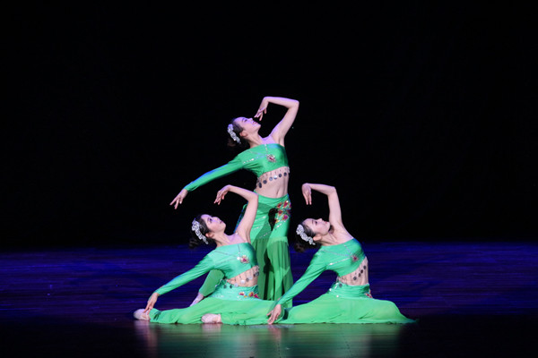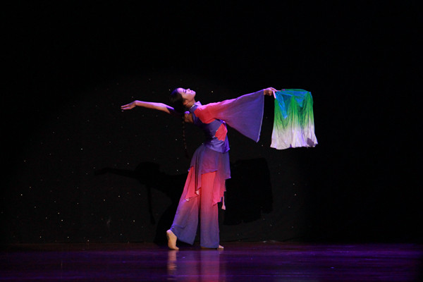 一段富有異國(guó)風(fēng)情的匈牙利性格舞蹈拉開演出的序幕,舞蹈《喜水》描繪了三位傣族少女在溪水邊嬉戲的歡快場(chǎng)景;輕快的喜鵲聲隨著舞者們輕盈的步伐由遠(yuǎn)及近,不同于一般舞蹈的優(yōu)雅柔美,舞蹈《喜鵲喳喳喳》描繪了熱鬧、歡騰的場(chǎng)面;群舞《泉》中,身著朝鮮族傳統(tǒng)服裝的少女們,頭頂瓦罐、踏著歌聲翩翩起舞;獨(dú)具民族風(fēng)情的《狼圖騰》由教師教育學(xué)院為數(shù)不多的男生演繹,表現(xiàn)了剛勁之美;群舞《在我生長(zhǎng)的地方》展現(xiàn)了祖國(guó)壯麗的美好山河;或古典或現(xiàn)代的單人舞串燒、別具風(fēng)格的現(xiàn)代雙人舞《鏡中人之你本來就很美》,最后的技能技巧展示環(huán)節(jié)將演出推向高潮,看似簡(jiǎn)單卻難度極高的動(dòng)作是同學(xué)們平時(shí)一遍又一遍訓(xùn)練的成果,博得觀眾陣陣掌聲。舞臺(tái)上絢麗的燈光、舞者們傾情的演繹、60多名工作人員默默地付出,使得演出圓滿落幕。“每天晚上我們都在舞房里練到寢室關(guān)門才回去,昨晚我們對(duì)燈光對(duì)到了晚上11點(diǎn)多,為的就是今晚能展現(xiàn)出最好的狀態(tài)。”一位舞者演出后興奮地說道。