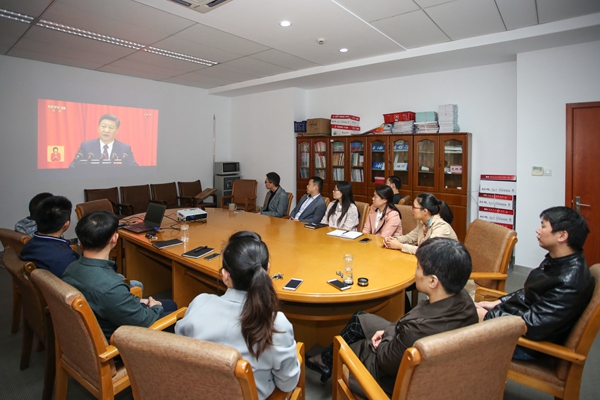 在明達樓,學(xué)校黨政領(lǐng)導(dǎo)及機關(guān)行政人員心懷喜悅,認真聽取了習(xí)近平總書記作的報告,一同回顧了過去五年,黨在全面建成小康社會、全面深化改革、全面依法治國、全面從嚴(yán)治黨等方面取得的歷史性成就,同時,也進一步明確了未來五年的歷史責(zé)任與奮斗目標(biāo)。大家一致表示,報告全面客觀、思路清晰、目標(biāo)明確、振奮人心。