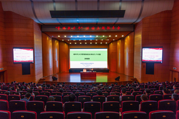 為進一步強化干部職工思想和形勢教育,充分認識管理提升對學校發展的迫切性。5月31日,學校舉辦了“管理提升年”活動第二場報告會。沈陽師范大學特聘教授、博士生導師、教育經濟與管理研究所所長孫綿濤教授在會上作“新時代大學管理制度改革的幾個問題”的主題報告。校領導班子成員,全體中層干部及科級干部,民主黨派、知聯會負責人,二級學院系主任等近300人一起聆聽了報告。報告會由校黨委書記劉劍虹主持。