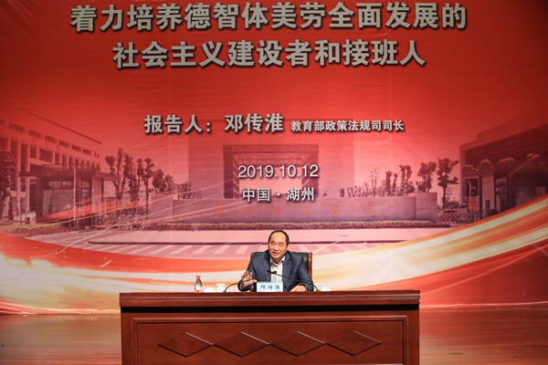 10月12日,教育部政策法規司司長鄧傳淮來校調研并應邀作報告。報告題目是“深入學習習近平總書記關于教育的重要論述,著力培養德智體美勞全面發展的社會主義建設者和接班人”,校領導、老領導、中層干部及師生黨員代表400多人聆聽了報告。校黨委書記金佩華主持報告。