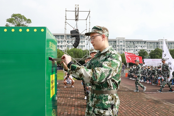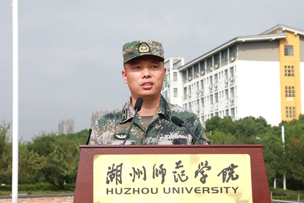 劉飛代表承訓部隊講話。他指出,軍訓期間,同學們要按照軍人的標準嚴格要求自己,繼承和發揚不怕苦、不怕累的精神,圓滿完成各項任務。同時,他希望新生通過軍訓能夠強化紀律意識,磨練意志品質,增強國防觀念;尊敬師長,關心集體,關愛他人,增強集體榮譽感;認真總結,有所感悟,培養優秀品質,使之成為將來生活、學習和工作中的寶貴財富。