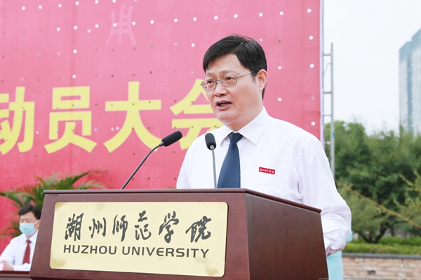 典禮上,蔣云良作了題為《慕鴻鵠以高翔 育英才以致遠》的講話。他首先向2021級新生的到來表示熱烈歡迎。他表示,湖州是一座歷史文化名城,是習近平總書記“綠水青山就是金山銀山”理念誕生地,希望新生用腳步去丈量這片土地、用心去閱讀這座城市。他和同學們探討了在當今一個大時代背景下,國家、社會、集體和個人的關系,并從三個方面提出要求:一是要明確個人和國家、個人和社會、個人和集體的關系,培養一種家國情懷;二是要重視第一課堂學習,加強第二課堂和第三課堂鍛煉,塑造新時代復合型人才;三是要融入新時代,有效規劃人生,實現自己的青春夢想。他相信,美麗的校園一定會因同學們而更加精彩,同學們奮進的青春印記也一定會為學校所銘刻。