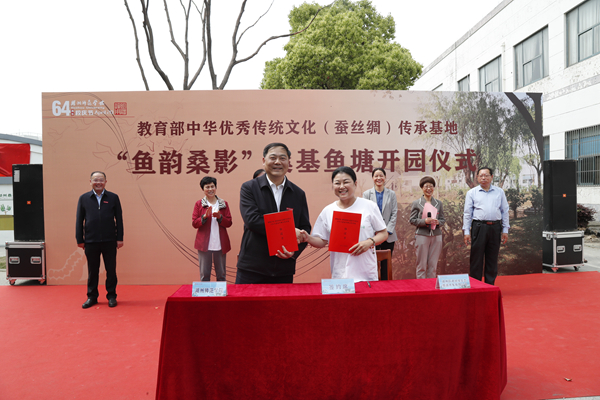 陳永華與徐敏利簽訂了共建蠶絲綢文化基地協(xié)議。根據(jù)協(xié)議,學校與湖州荻港徐緣生態(tài)旅游開發(fā)有限公司將在項目申報、活動舉辦、產(chǎn)品展示、學生創(chuàng)新創(chuàng)業(yè)等方面深化合作,更好地推進全球重要農(nóng)業(yè)文化遺產(chǎn)湖州桑基魚塘系統(tǒng)進高校與中華優(yōu)秀傳統(tǒng)文化(蠶絲綢)基地進社區(qū),共同培植蠶絲綢文化的潛在“種子”,為蠶絲綢文化在浙江、全國乃至世界更好地傳承和發(fā)展做出貢獻。