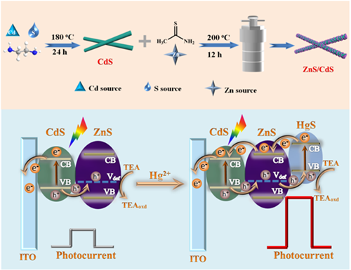 該論文研究一種基于CdS納米線和ZnS量子點的光電化學傳感平臺,用于環境水樣中汞離子的超低濃度的高靈敏檢測。研究發現,所合成的ZnS/CdS異質結催化劑表現出優異的光電化學特性,其中CdS納米線和ZnS量子點可分別作為光電化學傳感檢測過程中的光敏劑和Hg2+識別探針。由此構建的分析傳感平臺,在可見光下對Hg2+特異性地呈現出增強的光電流響應,原位形成的具有雙type-Ⅱ型異質結構的HgS/ZnS/CdS復合物進一步增強了光電化學傳感平臺的光生電荷分離效率,線性響應范圍為0.0010-5.0 nM,檢測限低至0.40 pM。此外,通過對環境水體中Hg2+離子的檢測,驗證了構建的光電化學傳感平臺傳感器的實際應用可行性。這種原位形成具有雙type-Ⅱ型異質結構的方法可望在可見光驅動的光電化學傳感檢測平臺設計方面獲得廣泛的應用。