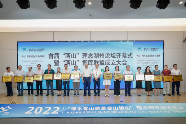 在“兩山”研究智庫聯盟成立儀式上,劉青松宣布聯盟成立,舒惠國和劉青松共同為“兩山”研究智庫聯盟成員單位授牌。該聯盟由湖州師范學院“兩山”理念研究院、中國生態(tài)文明研究與促進會等21家單位共同發(fā)起組建。圍繞“兩山”轉化、綠色發(fā)展與生態(tài)文明建設的重大理論與現實問題,協(xié)同開展理論研究、咨政建言、社會服務、人才培養(yǎng)、國際交流等工作,打造具有“中國特色、世界影響”的新型高端智庫聯盟。