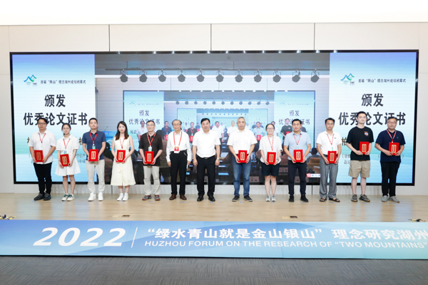 王瑞璞與金佩華為本次論壇優(yōu)秀論文作者頒發(fā)證書。《小康》雜志社華東新聞中心主任周宇發(fā)布了《2022年湖州市綠色低碳生活指數報告——數字化改革助力百姓踐行綠色低碳生活》。