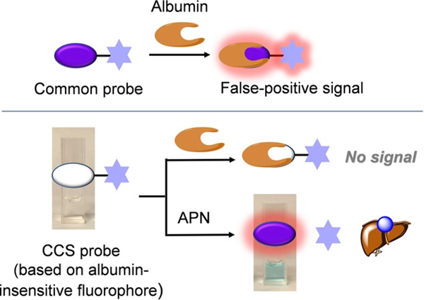 蛋白酶與許多疾病密切相關,利用光學探針對其高靈敏度、高選擇性熒光成像與檢測在人類健康研究中具有重要意義。然而,許多熒光探針或熒光團可與生物系統中普遍存在的白蛋白發生非特異性的相互作用,并導致顯著的熒光信號增強現象,從而對蛋白酶的準確檢測造成嚴重的假陽性干擾。這已成為一個棘手和難以解決的問題。
