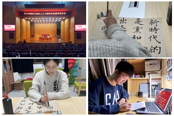 藝術學院舉辦了黨的二十大精神專家輔導報告會,邀請馬克思主義學院張建慶教授作題為“路漫漫其修遠兮——二十大報告‘中國式現(xiàn)代化道路’解讀”的講座。張教授從“回看”“對比”“遠眺”這三個方面展開,通過歷史、文化、政治、經(jīng)濟等維度,全面解讀了“中國共產(chǎn)黨為什么行、中國特色社會主義道路為什么走得通”的原因,闡述了中國共產(chǎn)黨作為“問路者、探路者、筑路者”的三重身份。學院還開展了“手抄報告金句,暢談青春理想”活動,學生黨員紛紛手抄黨的二十大報告金句。