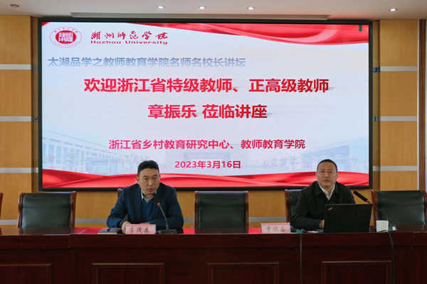 近日,“太湖品學之教師教育學院名師名校長講壇(七)”在我校順利舉辦。本次講壇由省鄉村教育研究中心、教師教育學院主辦,特邀杭州市富陽區富春第七小學教育集團書記、校長章振樂擔任主講人,作了主題為“‘從小熱愛勞動’——新勞動教育的富陽實踐”的專題講座。校原黨委書記、省鄉村教育研究中心主任劉劍虹出席,教師教育學院教師及學生等100余人參加。