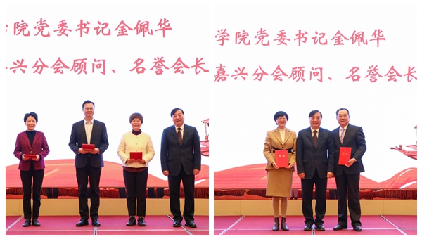 金佩華、許慧霞、朱鴻為嘉興分會新一屆組織機構成員頒發聘書。孫建良與沈丁華進行了會旗交接儀式。