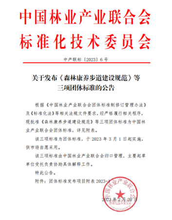 《特色(血糖調適)森林康養基地建設指南》國家級團體標準由中國林業產業聯合會森林康養分會提出,由中國林業產業聯合會歸口管理,由于景寧畬族自治縣生態林業發展中心牽頭編制并提供經費支持,我校經濟管理學院張建國教授牽頭組建團隊負責具體編制工作。該標準由中國林業產業聯合會2021年11月23日正式發文批準立項并正式啟動編制工作,編制團隊克服新冠疫情影響等困難,多次組織研討會討論標準內容,形成征求意見稿后面向全國森林康養基地(企業)征求意見,修改完善后形成評審意見稿。2022年12月26日,由中國林業產業聯合會標準化技術委員會、中國林業產業聯合會森林康養分會通過線上會議方式組織召開了《特色(血糖調適)森林康養規范》和《特色(血糖調適)森林康養基地建設指南》團體標準專家評審會,順利通過評審。編制工作團隊根據評審專家意見,進行了逐條修改完善形成了報批稿。2023年2月20日,中國林業產業聯合會標準化技術委員會以《中產聯標[2023]6號》文正式批準發布。