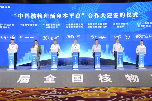 大會的閉幕式上舉行了中國核物理預印本平臺合作共建簽約暨平臺啟動儀式。儀式上,中國科學院文獻情報中心副主任張智雄宣讀《中國核物理預印本平臺情況簡介》,詳細介紹了預印本交流及我國建設預印本平臺的意義。隨后,中國核物理學會理事會秘書長郭冰宣讀中國核物理預印本平臺管理委員會、科學咨詢委員會、首批合作期刊名單。最后,7家合作共建機構代表上臺簽約,并共同啟動中國核物理預印本平臺,標志這一平臺正式上線發布。期待預印本平臺能更更好地服務于科研工作者,服務于國家科技創新事業,提升我國在核物理領域的話語權和影響力。