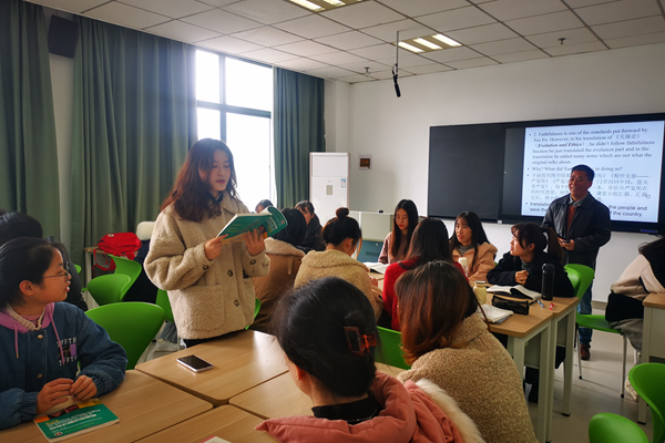 在中國文化概要課程的教學(xué)中,段自力將優(yōu)秀傳統(tǒng)文化的講授與其在當(dāng)代社會中的價值結(jié)合,引導(dǎo)學(xué)生關(guān)注傳統(tǒng)文化的當(dāng)代價值。在理論教學(xué)中,他也注重挖掘翻譯知識中蘊藏的價值元素。通過譯理、譯技、譯史、譯家、譯事、譯訓(xùn)的講授,他指導(dǎo)學(xué)生閱讀譯家故事、體驗翻譯事件、撰寫學(xué)習(xí)心得。他講述莎劇翻譯家朱生豪不顧自身貧病交加,在戰(zhàn)火紛飛的20世紀三四十年代,以一己之力,完成第一部中譯莎士比亞戲劇全集的歷程,并引導(dǎo)學(xué)生課后閱讀《朱生豪傳》等相關(guān)資料,體悟朱生豪的使命感和責(zé)任感。他以翻譯家嚴復(fù)1898年翻譯出版《天演論》為例,與學(xué)生一起研討嚴復(fù)采取非正法的“達旨”譯法翻譯《天演論》的價值追求。教師提供任務(wù)支架,學(xué)生小組合作、課前查閱相關(guān)資料、課中匯報討論、課后學(xué)習(xí)通提交成果,通過體驗式學(xué)習(xí),引導(dǎo)學(xué)生內(nèi)化翻譯知識,培養(yǎng)運用知識的能力,感受翻譯家的愛國情懷和責(zé)任擔(dān)當(dāng)。