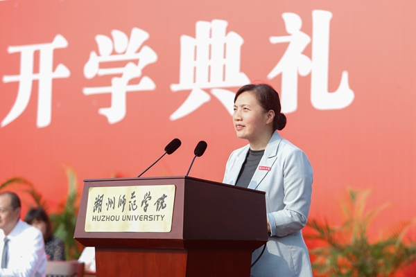典禮上,許慧霞以《大道如砥 行者無疆》為題寄語新生,代表學(xué)校對(duì)2023級(jí)新同學(xué)表示熱烈歡迎。她說:“天下湯湯,道路萬千。來自五湖四海的新同學(xué)們沿著不同的道路匯聚湖師,道路將我們與你們相連,將夢(mèng)想與現(xiàn)實(shí)相連,也將過去、現(xiàn)在與未來相連。”她以“道路”二字切入主題,并引申出“道”,指出“道”是軌跡、是行動(dòng)、亦是真理。同學(xué)們正是用自己的腳步追隨著中華民族的復(fù)興之路、強(qiáng)國(guó)之路。作為師長(zhǎng),許慧霞與新同學(xué)們分享了三點(diǎn)建議:一是矢志不移,堅(jiān)守天下為公的人生之道。一代代湖師人奮斗在國(guó)家經(jīng)濟(jì)社會(huì)建設(shè)的各條賽道上,創(chuàng)造了巨大的社會(huì)價(jià)值。同學(xué)們要以前行者為榜樣,厚植家國(guó)情懷、勇?lián)鷷r(shí)代使命,用腳步丈量祖國(guó)大地,用眼睛發(fā)現(xiàn)中國(guó)精神,用耳朵傾聽人民呼聲,用內(nèi)心感應(yīng)時(shí)代脈搏,用青春之履在祖國(guó)大地上留下最堅(jiān)定、最踏實(shí)的足跡。二是勤學(xué)不怠,走好成長(zhǎng)成才的大學(xué)之道?!按髮W(xué)之道,在明明德,在親民,在止于至善。”大學(xué)的正道,就是通過正己修身、格物致知來革新自我與民眾,并努力達(dá)到盡善盡美的境界。大學(xué)之道絕非單一局限、一馬平川,學(xué)校搭建了高度個(gè)性化的人才培養(yǎng)體系和“一站式”學(xué)生社區(qū)與成長(zhǎng)陪伴智慧平臺(tái),幫助大家充分開闊學(xué)術(shù)視野,開拓出屬于自己的最優(yōu)成長(zhǎng)路徑。三是步履不停,踏上擁抱未知的突破之道。當(dāng)前世界百年未有之大變局加速演進(jìn),不斷擴(kuò)大的未知圈時(shí)刻都在呼喚新的變革與突破。同學(xué)們生逢其時(shí),走在強(qiáng)國(guó)建設(shè)、民族復(fù)興的康莊大道上,重任在肩,愿同學(xué)們不忘來時(shí)路、不負(fù)今朝景,踔厲奮發(fā)、篤行不怠,讓青春在為祖國(guó)、為人民、為民族、為人類的人間正道中綻放出更加絢麗的光彩。