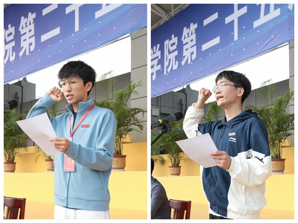 裁判員代表、體育學(xué)院教師李雪劍,運(yùn)動(dòng)員代表、生科院學(xué)生朱禮顯分別鄭重宣誓。