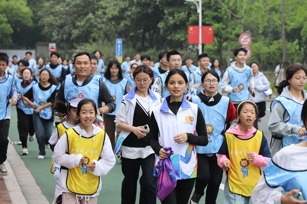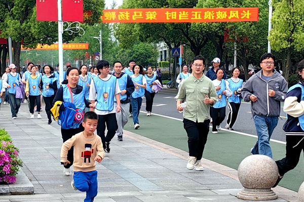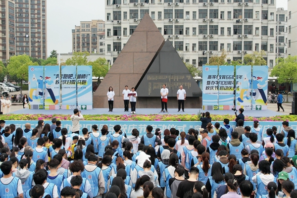 儀式結束后,陳永華宣布“奔跑吧,湖師!”?,F場66組校友親子和1500余名師生從恩澤碑出發,沿明達路途經時光隧道、校訓廣場、數字圖書館、南潯河、德清湖畔等站點至東校區操場,攜手前進享奔跑樂趣,用奔跑展望學校更加輝煌的明天。