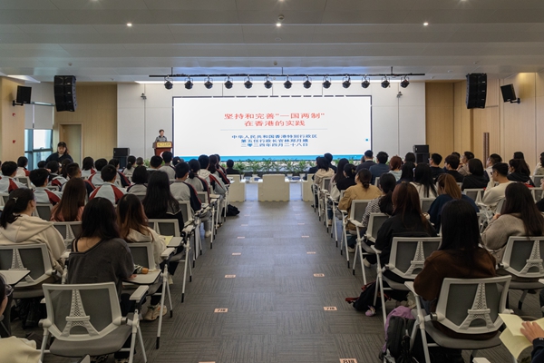 報告會上,林鄭月娥女士以《堅持和完善“一國兩制”在香港的實踐》為主題,從回顧歷史、香港特區的憲制秩序、特區行政長官的憲制地位、堅持和完善“一國兩制”的實踐、教育的重要性等五個方面講授了“一國兩制”在香港的實踐,分享了自己在擔任第五任行政長官期間的體會感悟和香港如何發揮“背靠祖國,聯通世界”優勢更好融入國家發展大局,表達了對香港未來的信心。