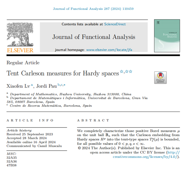 近日,我校理學院多復變研究團隊成員呂小芬教授(第一作者)與巴塞羅那大學Pau Jordi教授合作,在分析學領域國際頂級學術期刊《Journal of Functional Analysis》發表了題為“Tent Carleson measures for Hardy spaces”的學術論文。該文利用調和分析的方法,徹底解決了多復變全純Hardy空間到帳篷空間上嵌入算子的有界性問題,為進一步研究這類函數空間上相關算子的特性提供了新的研究方法。該研究工作得到了國家自然科學基金面上項目的資助,我校為第一完成單位。