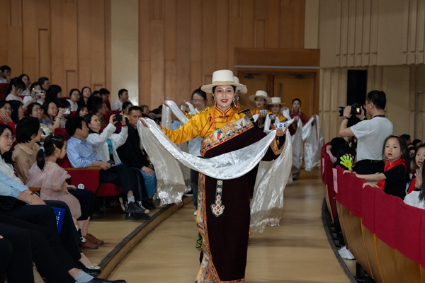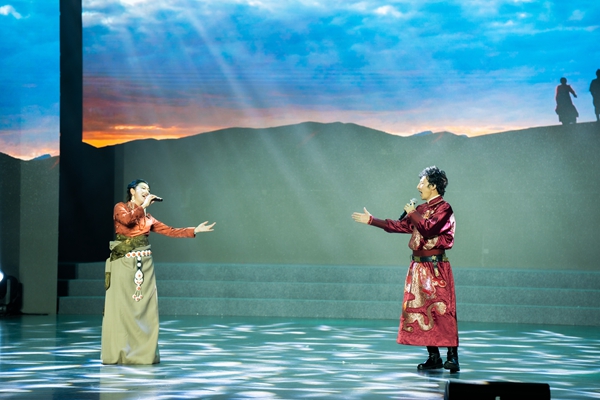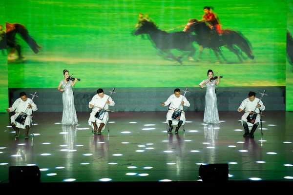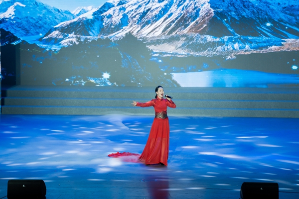 女聲獨唱《青藏高原》中的女高音清亮動人,讓觀眾如身臨其境,感受到海西州震撼人心的高原風光。器樂聯奏《愛在海西》將中西樂器合璧,描繪出海西文化的絢爛璀璨,深情的旋律中盡是海西人民對家鄉與祖國的熱愛。群舞《那達慕盛會》《弦音鼓舞》融入蒙古族獨有民俗元素的舞蹈設計,展現了少數民族善騎善射、能歌善舞的品質。在歌舞《馬背上的民族》中,熱情的高原兒女走下舞臺,將潔白的哈達和一碗碗酥油茶獻給在場嘉賓,將現場氣氛推向高潮。
