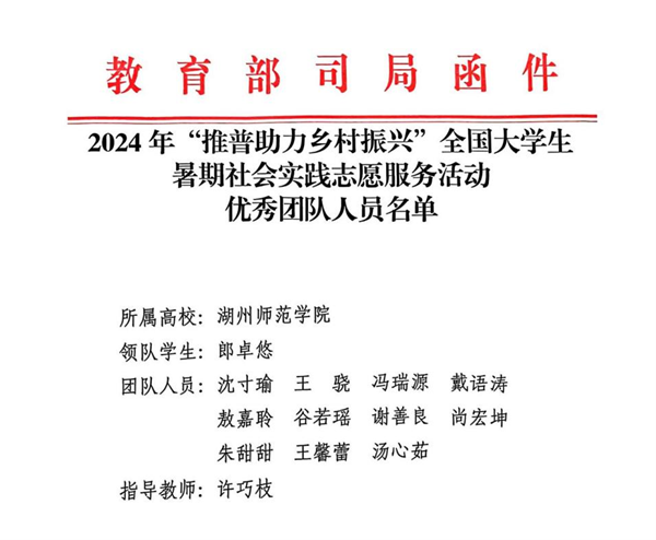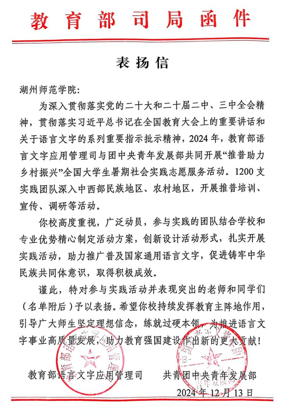 為深入學(xué)習(xí)貫徹落實(shí)黨的二十大和二十屆三中全會(huì)精神,加大國(guó)家通用語(yǔ)言文字推廣力度,國(guó)家語(yǔ)言文字工作委員會(huì)于2024年暑期開(kāi)展了“推普助力鄉(xiāng)村振興”全國(guó)大學(xué)生暑期社會(huì)實(shí)踐志愿服務(wù)活動(dòng)。全國(guó)共計(jì)有6998支團(tuán)隊(duì)7萬(wàn)余名師生報(bào)名參加,經(jīng)教育部語(yǔ)言文字應(yīng)用管理司組織評(píng)審,最終確定1200支團(tuán)隊(duì)入選,國(guó)家語(yǔ)言文字推廣基地(湖州師范學(xué)院)選派的大學(xué)生志愿者服務(wù)團(tuán)隊(duì)中有兩支通過(guò)了遴選。團(tuán)隊(duì)赴青海海西藏族自治州格爾木市等地開(kāi)展活動(dòng),實(shí)踐成效斐然。實(shí)踐活動(dòng)結(jié)束后,教育部評(píng)選出240支優(yōu)秀團(tuán)隊(duì)。我校人文學(xué)院“浙青聯(lián)動(dòng)——湖州師范學(xué)院推普助力鄉(xiāng)村振興實(shí)踐團(tuán)”團(tuán)隊(duì)獲教育部表彰。