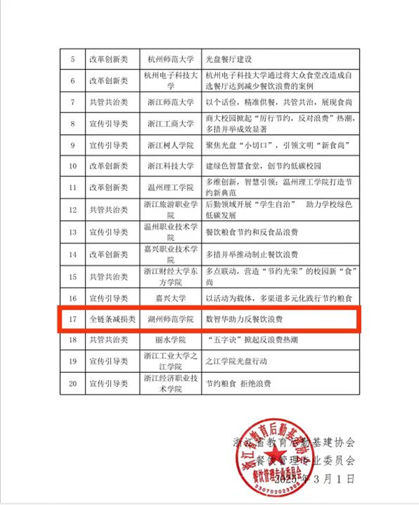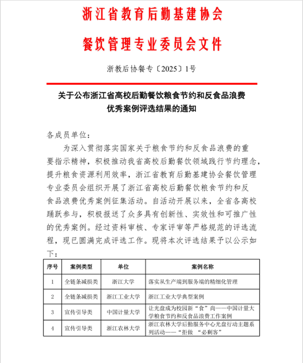 近日,浙江省高校后勤餐飲糧食節(jié)約和反食品浪費(fèi)優(yōu)秀案例評選結(jié)果揭曉,有20項(xiàng)案例入選。我校后勤服務(wù)中心申報的《數(shù)智華助力反餐飲浪費(fèi)》案例成功入選全鏈條減損類案例,該類型案例全省僅3項(xiàng)。此次評選旨在為深入貫徹落實(shí)國家關(guān)于糧食節(jié)約和反食品浪費(fèi)的重要指示精神,積極推動我省高校后勤餐飲領(lǐng)域踐行節(jié)約理念,提升糧食資源利用效率。