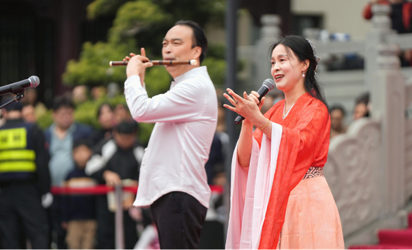 緊接著,毛云崗教授的竹笛與陸娟華老師的湖州方言蠶歌聯(lián)唱《清明贊蠶花》,在悠揚(yáng)的歌聲中,身著紗衣的姑娘們手持花籃,向觀眾席拋灑蠶花和糖果,重現(xiàn)了“軋蠶花”古俗的喜慶氛圍,將千年蠶俗的靈動(dòng)韻律推向高潮。