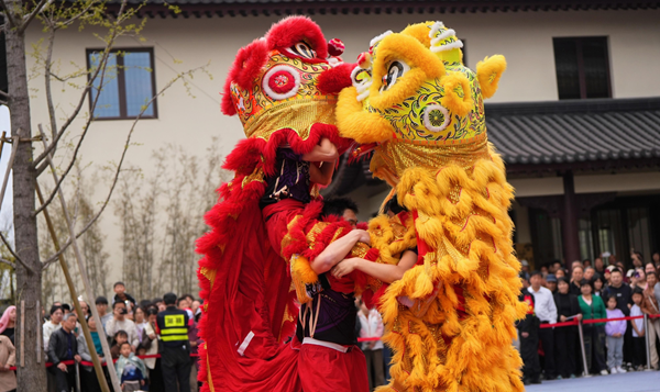 演出以喻超、潘博文等8名學(xué)生表演的《舞獅祈蠶神》拉開(kāi)帷幕。金色、紅色兩頭雄獅在桑田中靈動(dòng)翻騰,展現(xiàn)出活力四射的氣氛。表演接近尾聲時(shí),“蠶花圣地祈豐年;福起含山納瑞祥”的對(duì)聯(lián)緩緩垂落,贏得了觀眾陣陣掌聲。