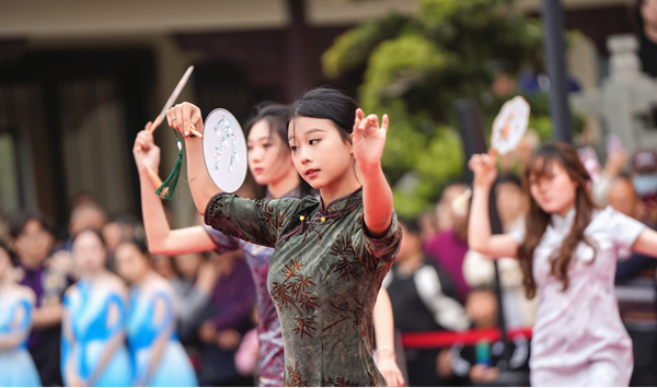 在《絲韻江南》的旗袍走秀中,十二位身穿旗袍的美麗姑娘手搖輕扇,漫步于江南水鄉(xiāng),演繹出東方女性的萬(wàn)種風(fēng)情,令人陶醉。