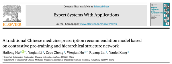 近日,我校信息工程學(xué)院智能計(jì)算研究所副教授胡海龍老師以第一作者、我校為第一單位在國(guó)際著名學(xué)術(shù)期刊《Expert Systems With Applications》(中科院一區(qū)TOP,IF =7.5)上發(fā)表題為“A traditional Chinese medicine prescription recommendation model based on contrastive pre-training and hierarchical structure network”的計(jì)算機(jī)學(xué)科與醫(yī)學(xué)交叉的研究成果,論文通訊作者是信息工程學(xué)院胡海龍副教授和胡文軍教授。