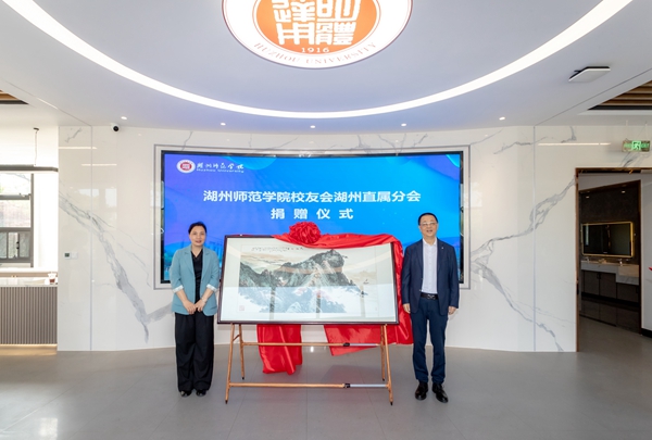 會(huì)上,湖州直屬分會(huì)向母校捐贈(zèng)了由湖州籍藝術(shù)家、我校客座教授張?zhí)炝叵壬鷦?chuàng)作的《大江行云》畫作,許慧霞代表學(xué)校接受捐贈(zèng)并為湖州直屬分會(huì)頒發(fā)捐贈(zèng)證書。