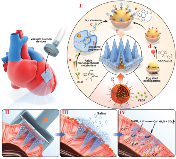 為了解決以上問(wèn)題,我校和陸軍軍醫(yī)大學(xué)合作的研究團(tuán)隊(duì)開(kāi)發(fā)了一種搭載微型機(jī)器人的微針貼片系統(tǒng),通過(guò)靶向心梗 - 酸性微環(huán)境實(shí)現(xiàn)了外泌體向深部損傷組織的精準(zhǔn)遞送。實(shí)驗(yàn)顯示,該智能貼片注射后其基底可釋放負(fù)載血管內(nèi)皮生長(zhǎng)因子的納米顆粒,有效附著于梗死心肌組織。研究不僅證實(shí)該裝置能三維重構(gòu)心肌梗死區(qū)域血管網(wǎng)絡(luò),更在大鼠模型中展現(xiàn)出顯著的心肌細(xì)胞保護(hù)效應(yīng)。此外,還成功通過(guò)微創(chuàng)胸腔鏡手術(shù)在兔和豬心臟中完成了智能貼片精準(zhǔn)遞送。在利用智能貼片對(duì)微環(huán)境的精準(zhǔn)調(diào)控并改善心肌梗死治療預(yù)后方面,這一研究非常具有醫(yī)用價(jià)值。