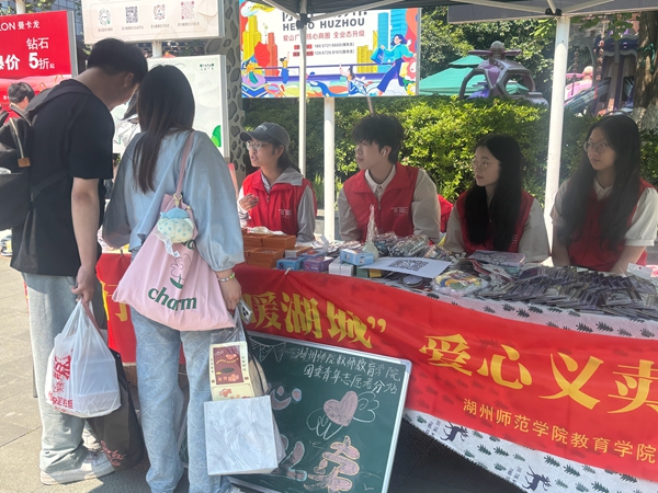 活動現場充滿新意:繽紛的海報、整齊的物資、創意造型門與互動游戲相映成趣,火紅的橫幅在微風中輕舞。教育學院的學生志愿者們手捧募捐箱、分發倡議書,向路過的市民們介紹“走進教育第一線”志愿服務品牌、“織里陪伴家+”志愿服務項目,每一份善款都將化作愛心物資,溫暖湖州隨遷子女的心田。這群青年志愿者正以實際行動詮釋責任擔當,為共建“美麗湖州”貢獻青春力量。