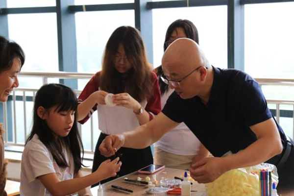 在蠶繭文創制作環節,張新江及助教團隊現場演示了蠶繭掛墜的制作秘籍。繭殼經彩筆描繪,瞬間幻化成彩虹色系。孩子們手持小剪刀,在助教老師指導下大膽創作:有的將金黃蠶繭剪出條紋,粘上小翅膀,再繪出圓鼓鼓的肚子,做成蜜蜂;有的給雪白繭殼畫上胡須,粘上鈴鐺,做成小貓咪;甚至有小朋友做出了小老虎、小黃人等許多栩栩如生的奇趣作品。