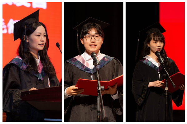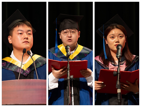 全國大學(xué)生外語能力大賽國賽金獎(jiǎng)獲得者、考取南京大學(xué)碩士研究生的外國語學(xué)院毛舒怡同學(xué),國家獎(jiǎng)學(xué)金獲得者、優(yōu)秀學(xué)生創(chuàng)業(yè)者、考取我校碩士研究生的經(jīng)濟(jì)管理學(xué)院宋滋同學(xué),國家獎(jiǎng)學(xué)金獲得者、考取上海交通大學(xué)碩士研究生的醫(yī)學(xué)院(護(hù)理學(xué)院)張瑜同學(xué)分別作為本科畢業(yè)生代表發(fā)言。他們深情表達(dá)了對(duì)母校和師長的感恩之情,并表示將永遠(yuǎn)銘記恩師的諄諄教誨和“明體達(dá)用”的校訓(xùn)精神,在未來的學(xué)習(xí)和工作中以追光者的姿態(tài)勇毅前行,以無畏的勇氣追逐心中熱愛。