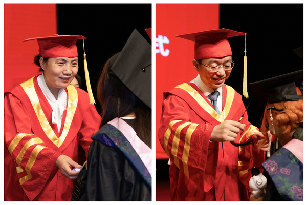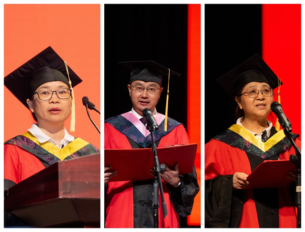 學(xué)位授予儀式上,校領(lǐng)導(dǎo)班子成員、教師代表為獲得碩士學(xué)位和學(xué)士學(xué)位的學(xué)生正冠撥穗、頒發(fā)學(xué)位證書并合影留念。