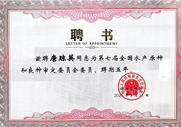 會議宣布了第七屆全國水產原種和良種審定委員會委員、第七屆全國水產原種和良種審定委員會顧問委員會和青年工作組組成人員名單。我校生命科學學院水產系羅氏沼蝦遺傳育種團隊帶頭人、原國家蝦蟹產業技術體系羅氏沼蝦種質資源與品種改良崗位科學家楊國梁研究員當選為顧問委員會委員,團隊骨干唐瓊英研究員當選為審定委員會委員,團隊青年骨干、現國家蝦蟹產業技術體系羅氏沼蝦種質資源與品種改良崗位科學家易少奎教授當選為青年工作組成員。