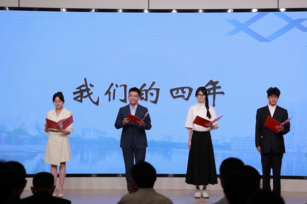 典禮在“我們的四年”詩朗誦中拉開序幕,俞則、胡逸雯、朱宸煜、沈鈺豐四位同學(xué)用詩句串聯(lián)起大學(xué)的回憶。胡家樂、嚴(yán)穎、王勝釗、朱哲凡四位同學(xué)以時(shí)間為線述說“安定·拾光”,講述了在書院的蛻變歷程。朱哲凡同學(xué)講述了與導(dǎo)師之間的溫情故事,吳凱同學(xué)的小提琴演奏《起風(fēng)了》表達(dá)了對大學(xué)時(shí)光的不舍與留戀。音樂聲中,畢業(yè)生們紛紛起身與相伴四年的領(lǐng)導(dǎo)與導(dǎo)師擁抱合影,將現(xiàn)場氛圍推向高潮。
