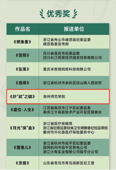 6月11日,由中國紀(jì)檢監(jiān)察雜志社、浙江省紀(jì)委省監(jiān)委等部門聯(lián)合主辦的第六屆“玉琮杯”清廉微電影微視頻大賽頒獎活動在杭州舉行。我校原創(chuàng)廉潔微電影《抄“欲”之鍵》與浙江師范大學(xué)、廣西大學(xué)、浙江傳媒學(xué)院等高校從全國2400余部參賽作品中脫穎而出,獲得大賽微視頻類優(yōu)秀獎。