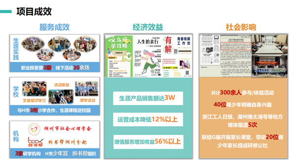項(xiàng)目成果:該項(xiàng)目經(jīng)過兩年探索運(yùn)營(yíng),平臺(tái)已在浙江省湖州市驗(yàn)證商業(yè)模式可行性:團(tuán)隊(duì)被中華網(wǎng)、浙江工人日?qǐng)?bào)等近十家媒體報(bào)道,累計(jì)開展30余場(chǎng)線下活動(dòng),設(shè)計(jì)3條研學(xué)路線,與斯坦福人生設(shè)計(jì)教練、青少年宮、湖州市心理協(xié)會(huì)等機(jī)構(gòu)組織達(dá)成合作,共服務(wù)500余人次,用戶復(fù)購(gòu)率達(dá)65%。