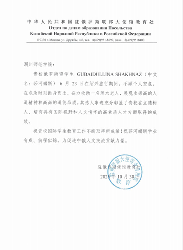 近日,中華人民共和國駐俄羅斯聯邦大使館教育處向我校致表揚信,表彰我校國際學生GUBAIDULLINA SHAKHNAZ(中文名莎河娜斯)6月23日在紹興旅行期間,不顧個人安危,在危急時刻挺身而出,奮力救助落水老人事跡。