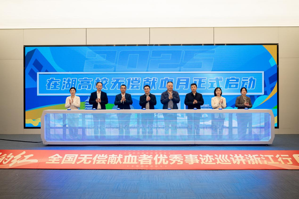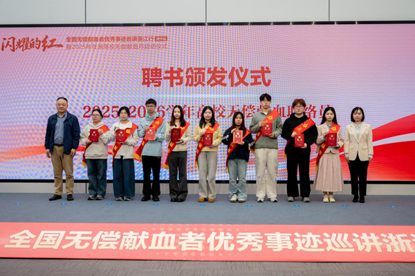 “浙”里行,最“閃耀”。11月4日,“閃耀的紅——全國無償獻血者優秀事跡巡講浙江行(湖州站)”暨2025年在湖高校無償獻血月啟動儀式在我校雙創中心七樓會議廳舉行。中國輸血協會監事長呂杭軍、獻血動員專業委員會主任委員丁文藝,我校黨委副書記丁敢真,湖州市社科院院長孫弘勛,湖州市新聞傳媒中心黨委委員、副主任吳繼任,湖州市教育局黨委副書記、副局長黃桂眾,湖州市衛生健康委黨委副書記、副主任胡小軍,湖州市團委副書記謝作靈,湖州市紅十字會副會長蔡惠琴出席。中國輸血協會巡講團成員,全市獻血工作聯席會議成員單位、各區縣衛健局和鄉鎮街道相關負責人,在湖高校教師、志愿者和學生代表等200余人參加。