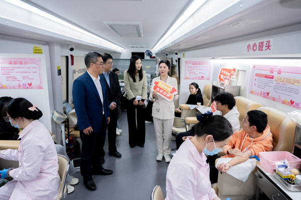 與會領導及嘉賓前往獻血車看望了正在參與獻血的愛心師生,送去了關懷慰問,并高度贊揚了他們的奉獻精神。