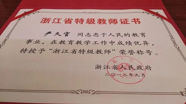 嚴久官,湖州師范??茖W校(現湖州師范學院)9312班學生,現任教浙江省衢州旅游學校,浙江省語文特級教師、正高級教師,曾獲全國黃炎培職業教育“杰出教師”。