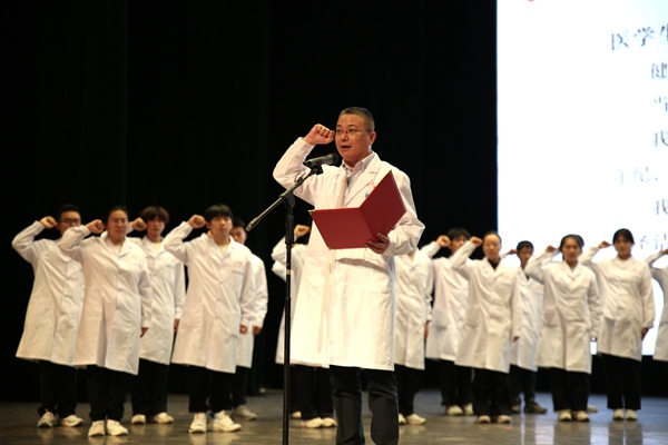 在附屬中心醫院副院長胡鴻宇的領誓下,2025級全體醫學生莊嚴宣誓。這既是對醫學事業的鄭重承諾,更是對青春使命的莊嚴宣告,彰顯了新一代醫學生的責任與擔當。