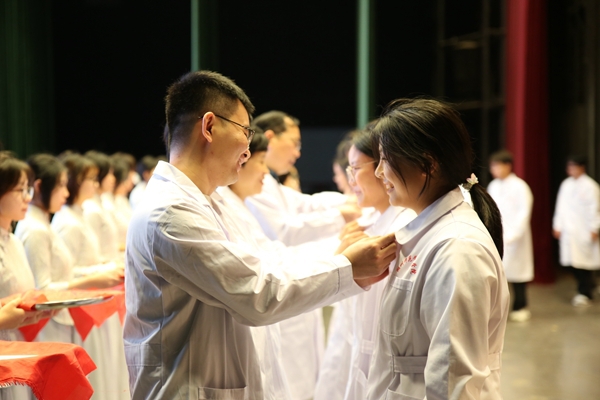 丁敢真代表學校向關心支持醫學教育的各界領導、醫護同仁及校友致謝,向新生致以問候。他指出,白衣加身意味著身份的轉變,前輩為新生扣上“第一粒扣子”,是初心與擔當的傳承。他希望新生忠于選擇,將個人理想融入健康中國建設;追求卓越,錘煉過硬醫術;勇于突破,擁抱時代變革,做醫學疆域的“拓荒者”。