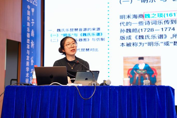 11月7日,由中國民族管弦樂學會(國家一級協會)、上海交通大學黨委宣傳部(文明辦)聯合主辦的“甲子鼎新·藝工融合——中國民族樂器改革與發展學術研討會”暨“民樂大師進校園·上海國際藝術節音樂會”在上海交通大學舉行。我校音樂學院教師、作曲家林舒瑜受邀作主旨報告《古律新聲——明代魏氏樂琵琶的音源制作與當代啟示》,系統闡述了魏氏樂琵琶的歷史音律、聲學特征與數字化復原過程,并展示了其自研音源“Pipa1617”。報告提出以AI與聲學建模實現“古樂復原”的新路徑,為民族樂器改革與數字音樂創作提供了創新范例。