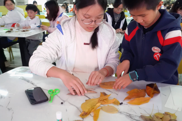 在“指尖創(chuàng)想”創(chuàng)作環(huán)節(jié),孩子們充分發(fā)揮想象力,將收集的自然素材轉(zhuǎn)化為獨(dú)具特色的藝術(shù)作品。低齡組孩子制作樹葉拼貼畫,用不同形狀的葉片拼出校園風(fēng)景和小動(dòng)物;高齡組孩子則創(chuàng)作干花書簽和生態(tài)瓶,將秋色定格在方寸之間。活動(dòng)期間,學(xué)校還貼心準(zhǔn)備了點(diǎn)心,為孩子們補(bǔ)充能量。