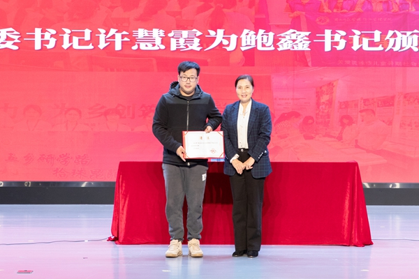 許慧霞為安吉縣孝豐鎮夏陽村黨支部書記、村委會主任鮑鑫頒發湖州師范學院大學生創新創業導師聘書。